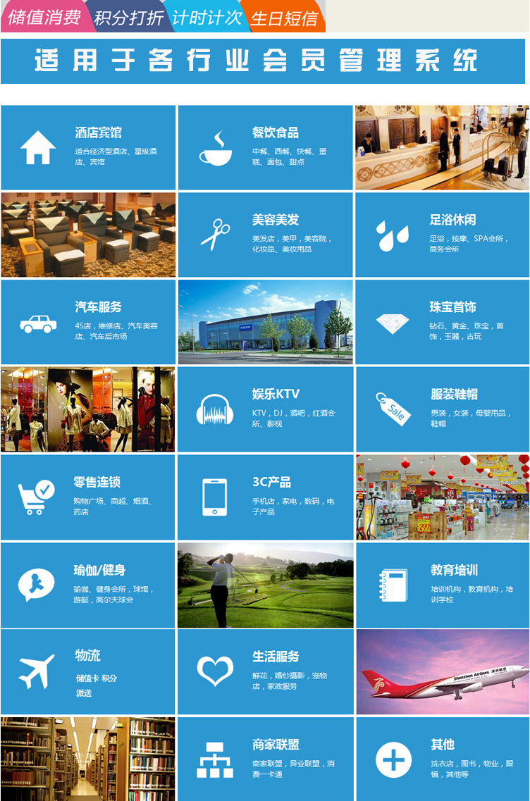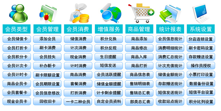 軟件可以儲值、積分、打折、計次、計時、會員管理、商品管理、商品進銷存、生日提醒、發(fā)送信息等等功能。