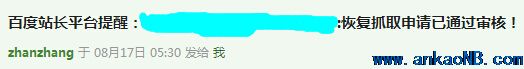 我是8月16日申請的恢復,到時是周末,我想要周一才能知道結果。結果出乎意料,百度8月17日凌晨給我回信,說審核通過??磥碇苣┮彩强梢陨暾堥]站保護恢復的。
