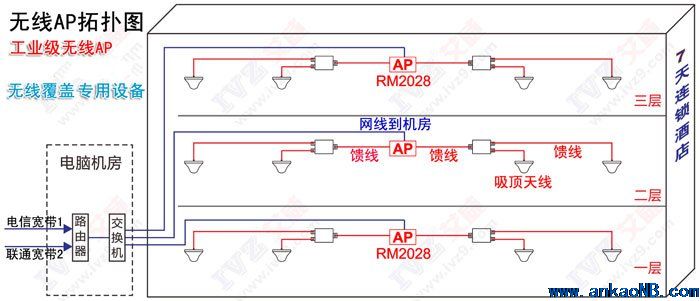 AP和吸頂天線安裝在樓道,施工簡單,無線信號(hào)穿透到樓道兩邊的房間,不用對(duì)每個(gè)房間進(jìn)行施工,也避免了設(shè)備裝在客房容易損壞。整個(gè)方案設(shè)備少,故障點(diǎn)少,運(yùn)行穩(wěn)定,安裝調(diào)試好后常年不用維護(hù)。如圖所示: