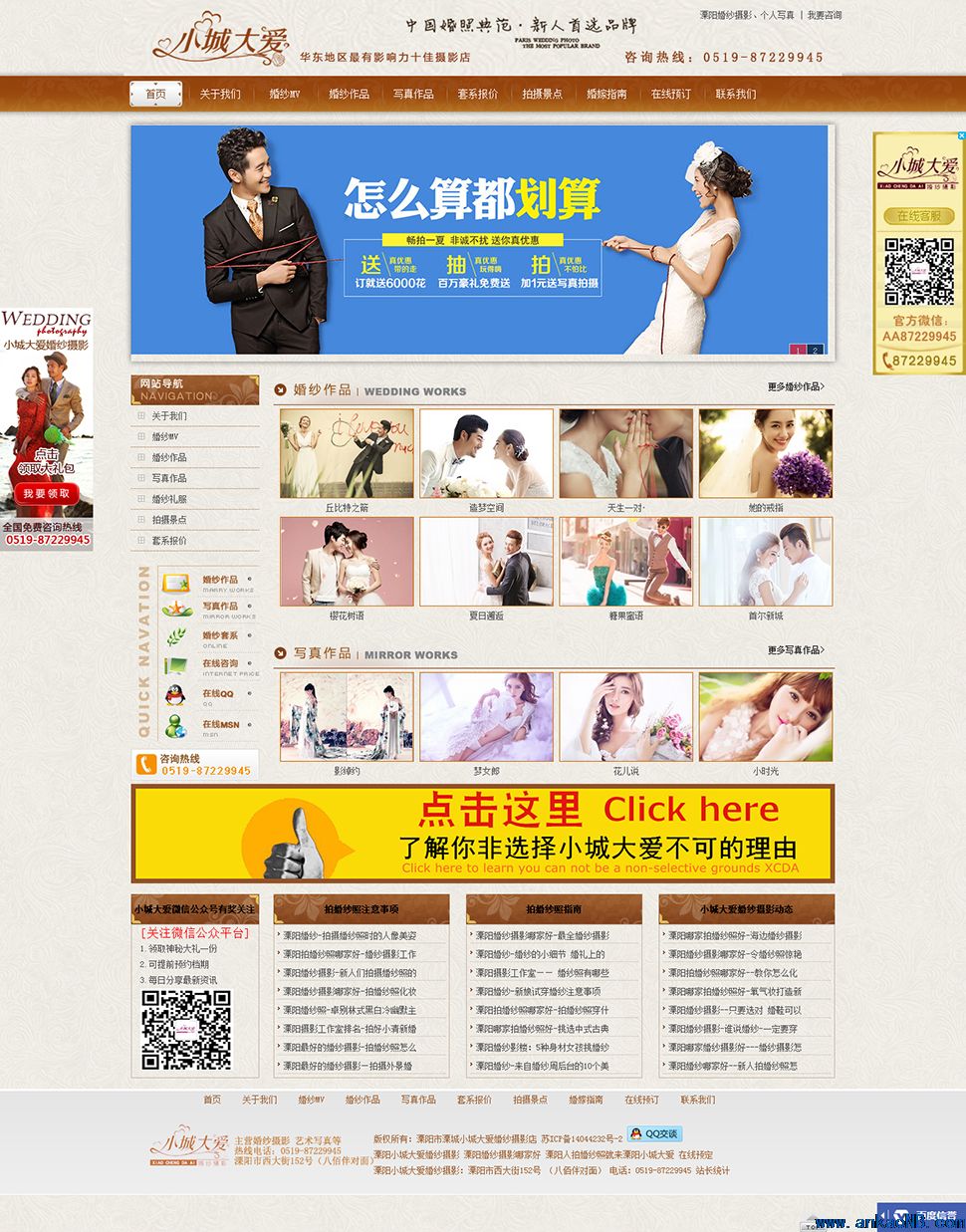 溧陽(yáng)市溧城小城大愛(ài)婚紗攝影店以“美麗至上,品質(zhì)至佳”為服務(wù)理念,擁有一支龐大專(zhuān)業(yè)的攝影團(tuán)隊(duì),憑借其別開(kāi)生面的化妝技術(shù)、時(shí)尚浪漫的婚紗選取、獨(dú)具匠心的視覺(jué)拍攝方式、一對(duì)一得人性化服務(wù)、細(xì)致入微的工作要求和透明合理的價(jià)格定位,讓攝影氛圍更輕松愜意,場(chǎng)景布置更親近自然,攝影師與新人的交流更親切自如,為新人們打開(kāi)了一道通往幸福的大門(mén)。獨(dú)特的調(diào)色方式和高超技藝的數(shù)碼設(shè)計(jì)師更是讓色調(diào)、影調(diào)、背景在感官視覺(jué)上清晰化、明朗化和生動(dòng)化。在溧陽(yáng)刮起了一場(chǎng)經(jīng)典藝術(shù)的婚紗攝影“炫風(fēng)”。